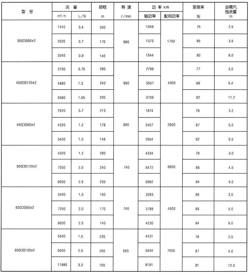 型號意義:以400DS-120×2為例 400-水泵(bèng)進水口名義直徑(mm)DS一多級雙(shuāng)進口中開離心泵 120-水(shuǐ)泵名義單級揚程(m) 2-水泵級數