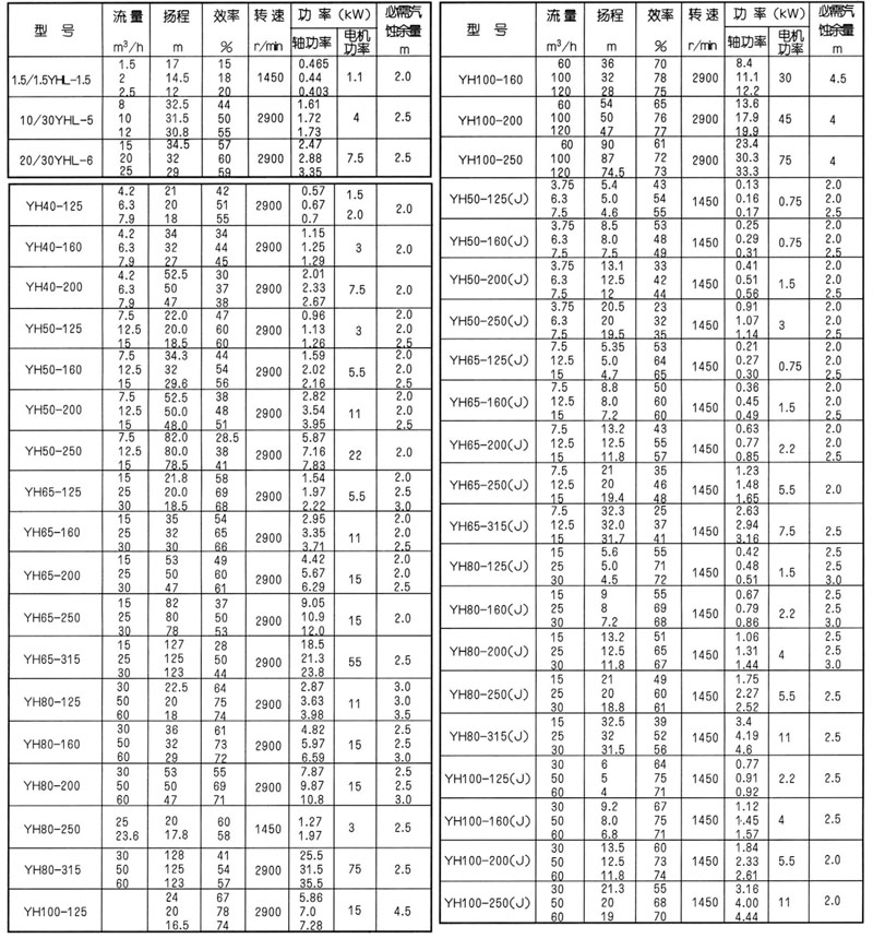 YH和YHL係列泵(bèng)是(shì)單級(jí)、單吸、液下式離心泵(1.5/1.5YHLI.5是旋渦泵),流量範圍1.5~120m/h;揚程範圍(wéi)2.5~127m。用於(yú)汲送井罐(guàn)中不含固體顆粒、無腐蝕性的介質(如發煙硫酸)。介質最高溫(wēn)度80℃。