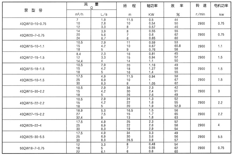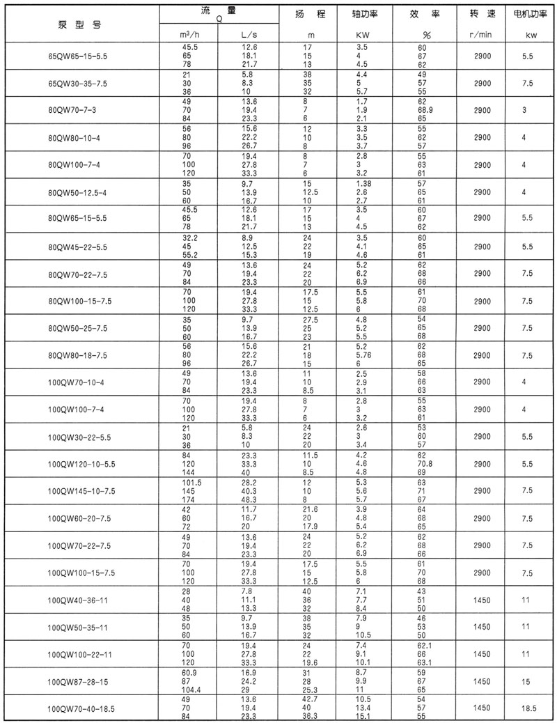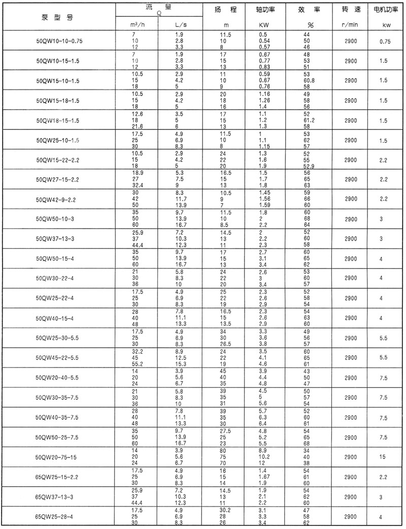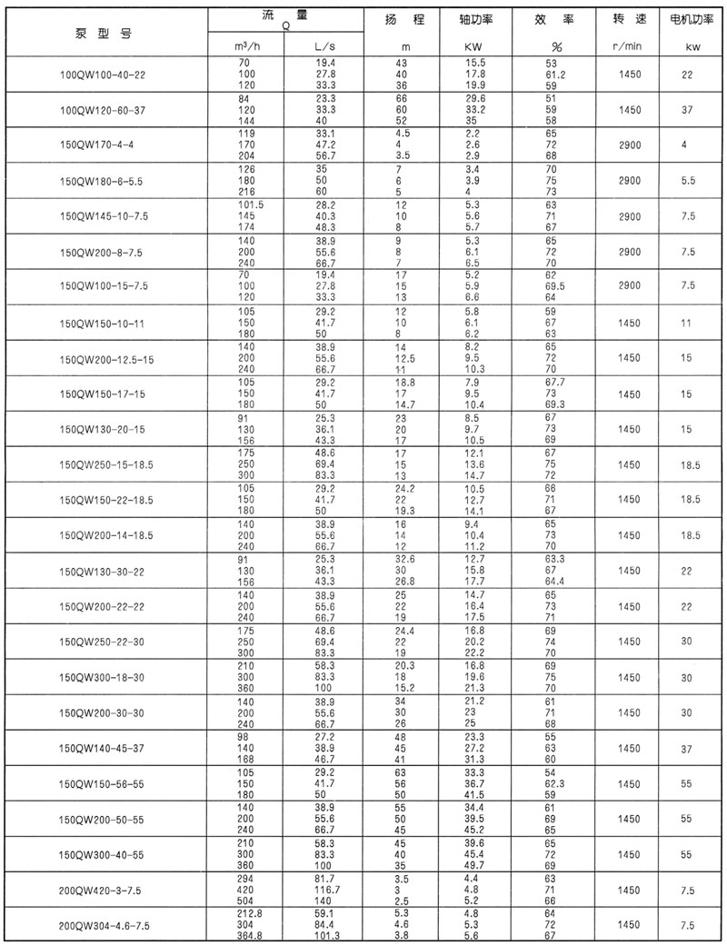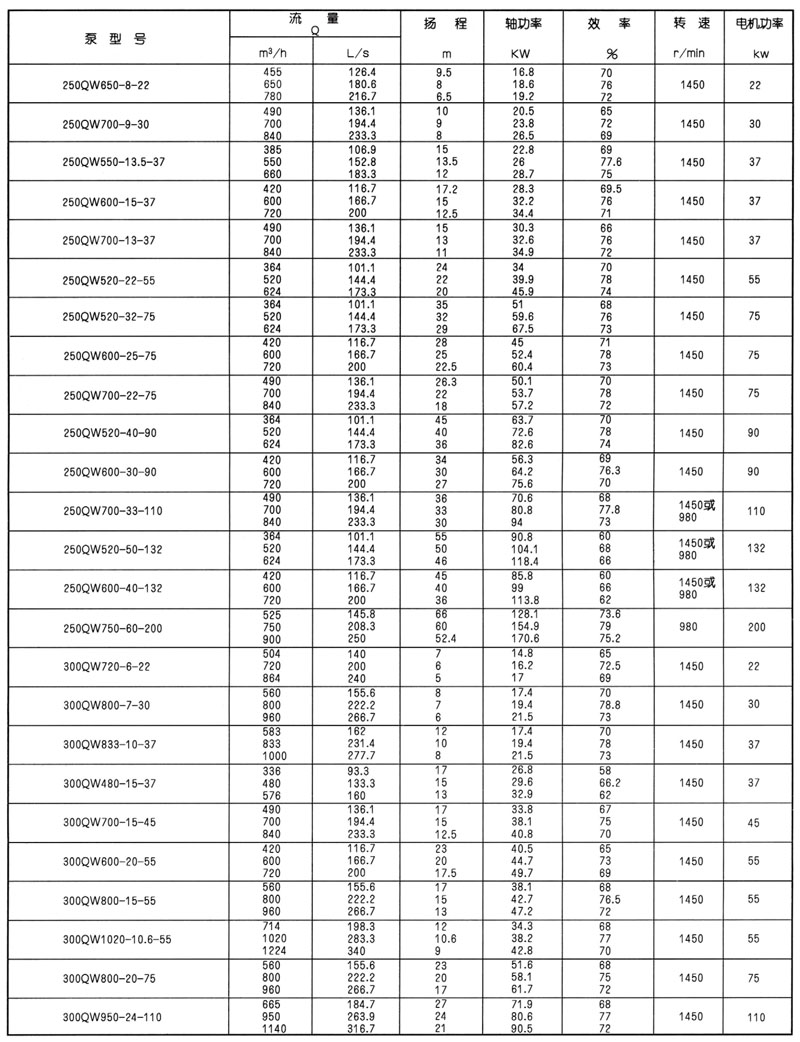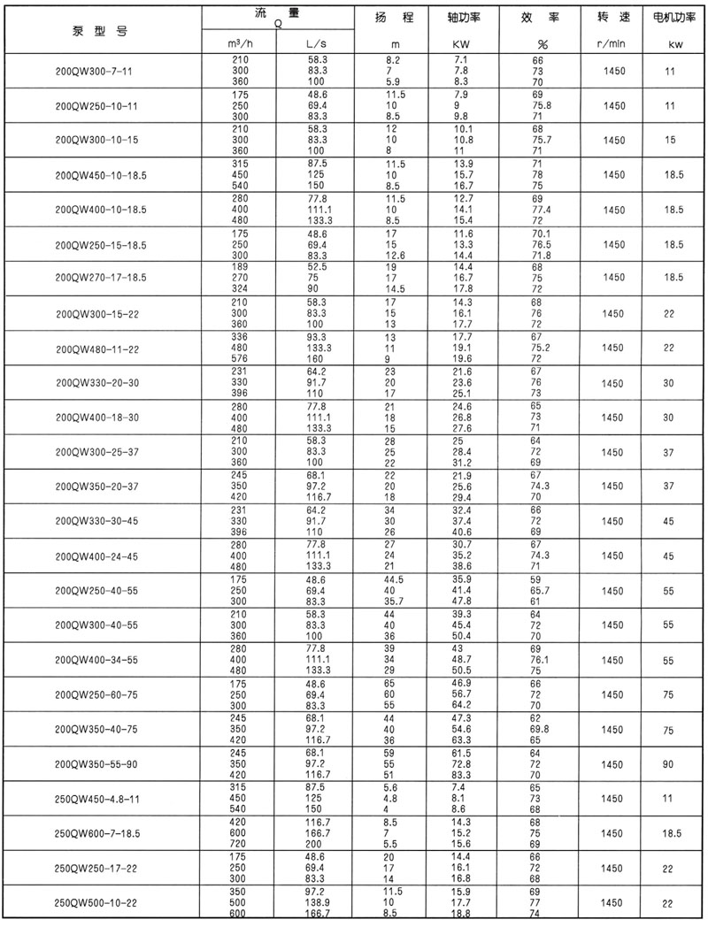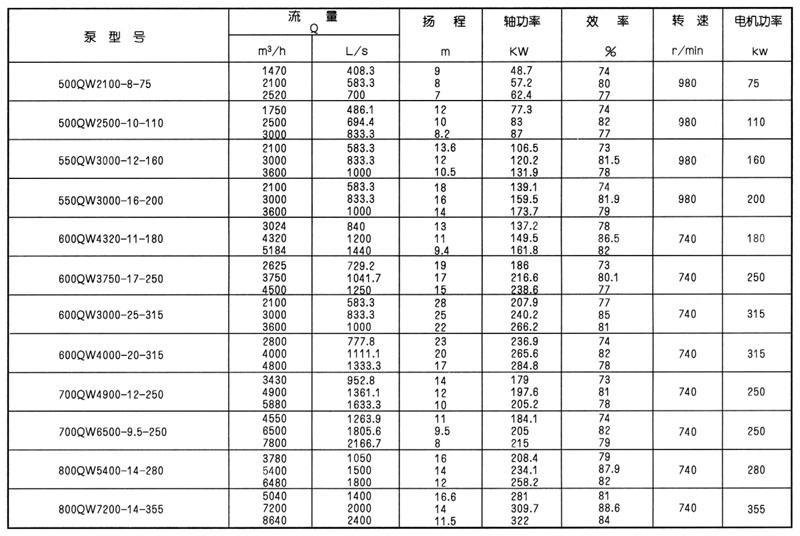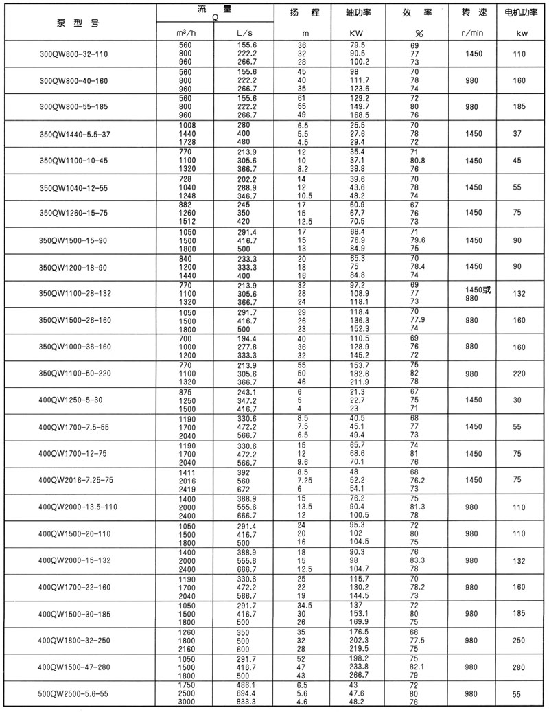 本泵流量範圍:7~8600m?/h;揚程範圍:3~80m;額定轉速:740~2900r/min;係統壓力: 1.0MPa;介質溫度-15~60℃;介質PH值範圍:4~10;介質密度: 1.3×10kg/m;電機防護等級IP68;電(diàn)機(jī)絕緣等級F級;每小時啟動次(cì)數(shù)不多於6次,且(qiě)間隔均勻;最大潛水深度20m;旋轉方向:從電機端看泵為順(shùn)時針方向旋轉。