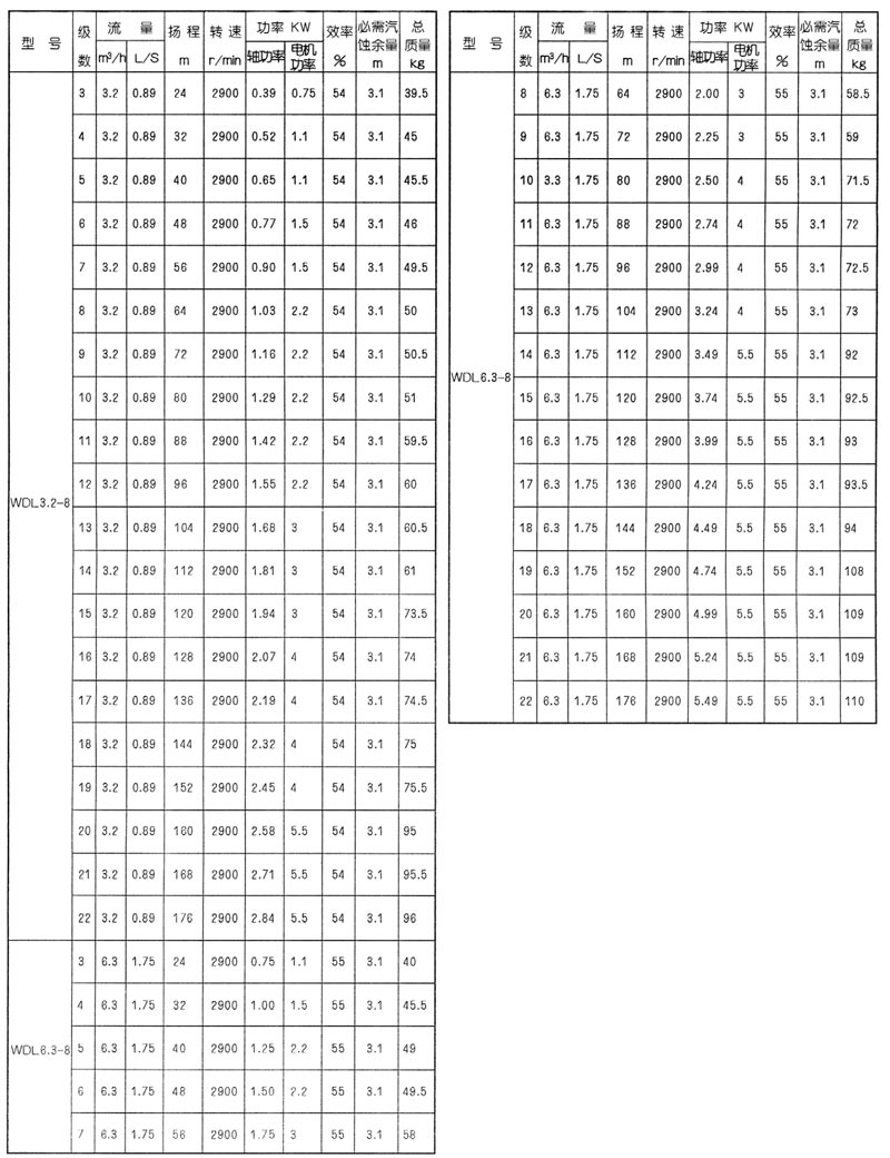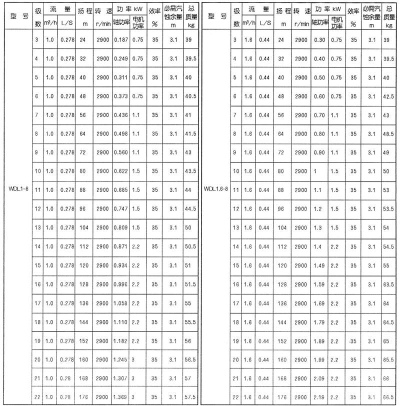 泵(bèng)型號意(yì)義:如WDL1.6-8×10。1.6-流量(m/h);8-單級揚程(m);10-級數。
