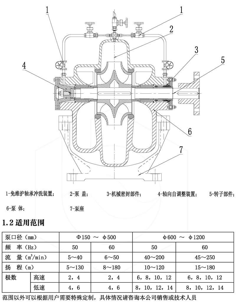 對於揚程較低的中開泵,使用(yòng)單殼體結(jié)構。為了減小泵在運行時產生的壓(yā)力脈(mò)動(dòng),泵的壓水室隔(gé)舌設計(jì)呈傾斜形狀。
